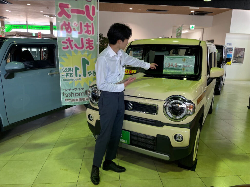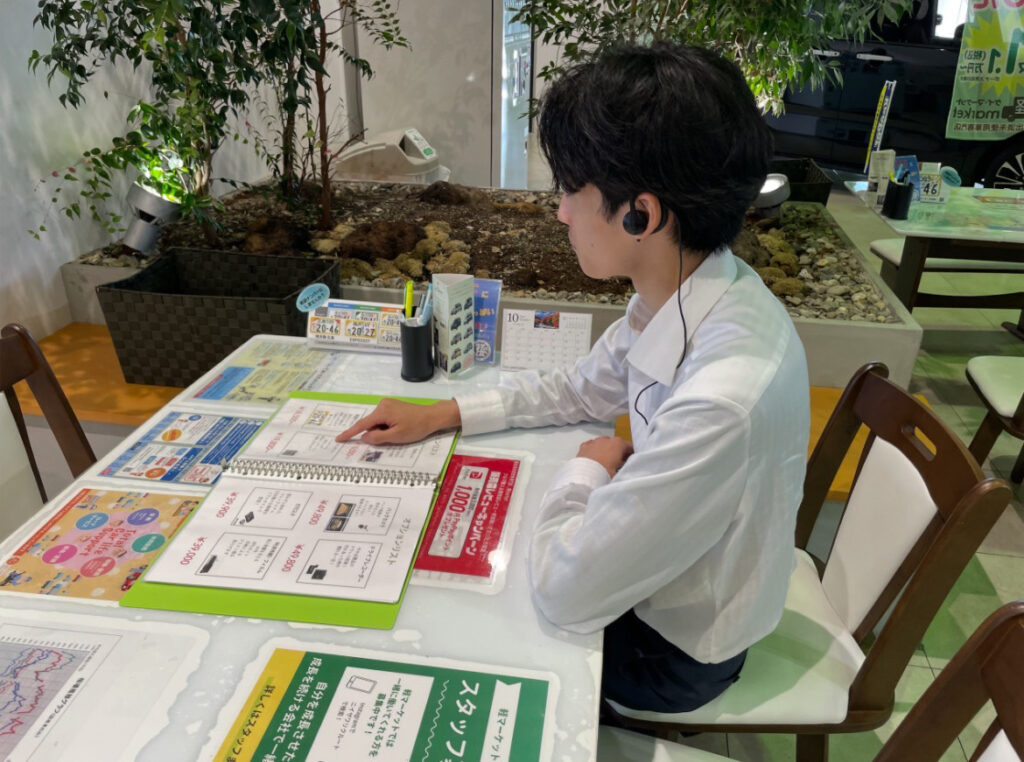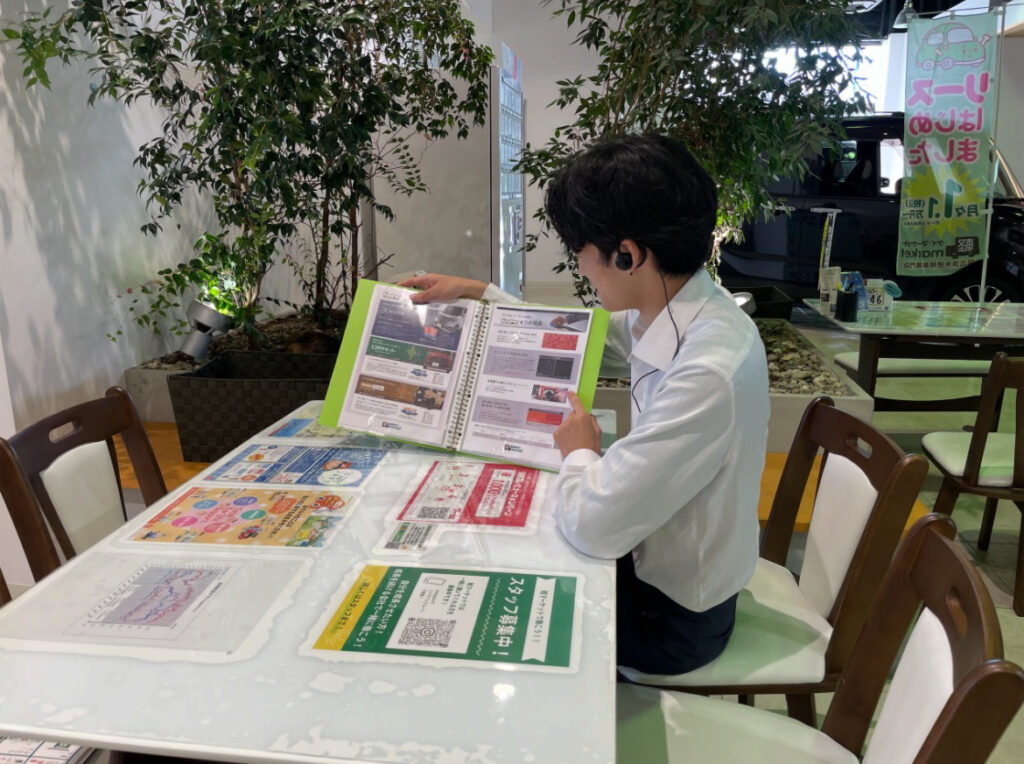接客内容は主に車の販売となる営業で、保険の提案も担当しています。